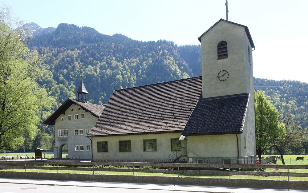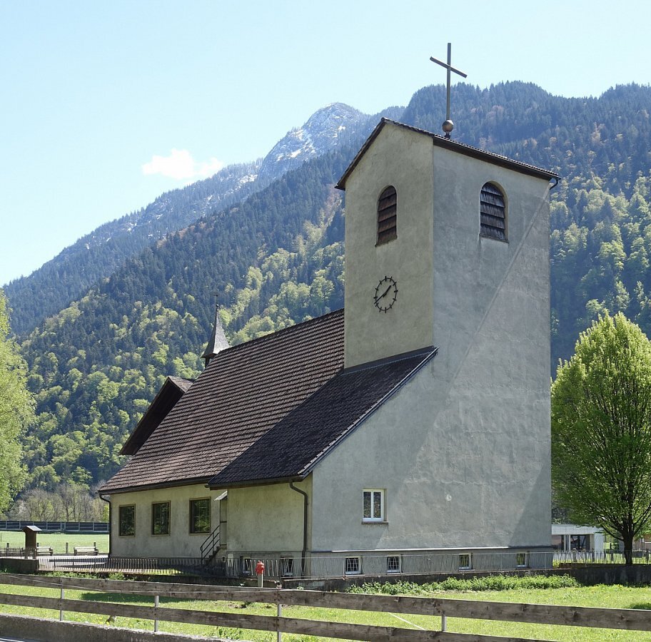 Bings Bludenz Heiligste Dreifaltigkeit, 1953 - 1955 Architekt Werner Pfeiffer, Rechteckbau mit Satteldach, Fresken Chorbogen Gottvater und Hl. Geist mit zwei Posaunenengel, Linkes Seitenschiff Auferstehung Christi als Übwerwinder von Tod und Bösem, rechts hl. Martin , bez,. H. Fritz, Holzfiguren, Hubert Fessler Hörbranz, 1953 - 59