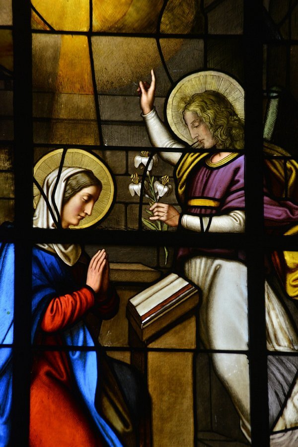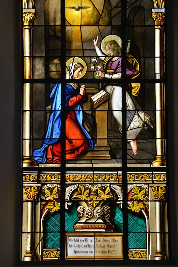 Glasmalereien im Chor 1857 von Ludwig Mittermeier, Lauingen an der Donau: li. Verkündigung an Maria, re. Heimsuchung Mariä